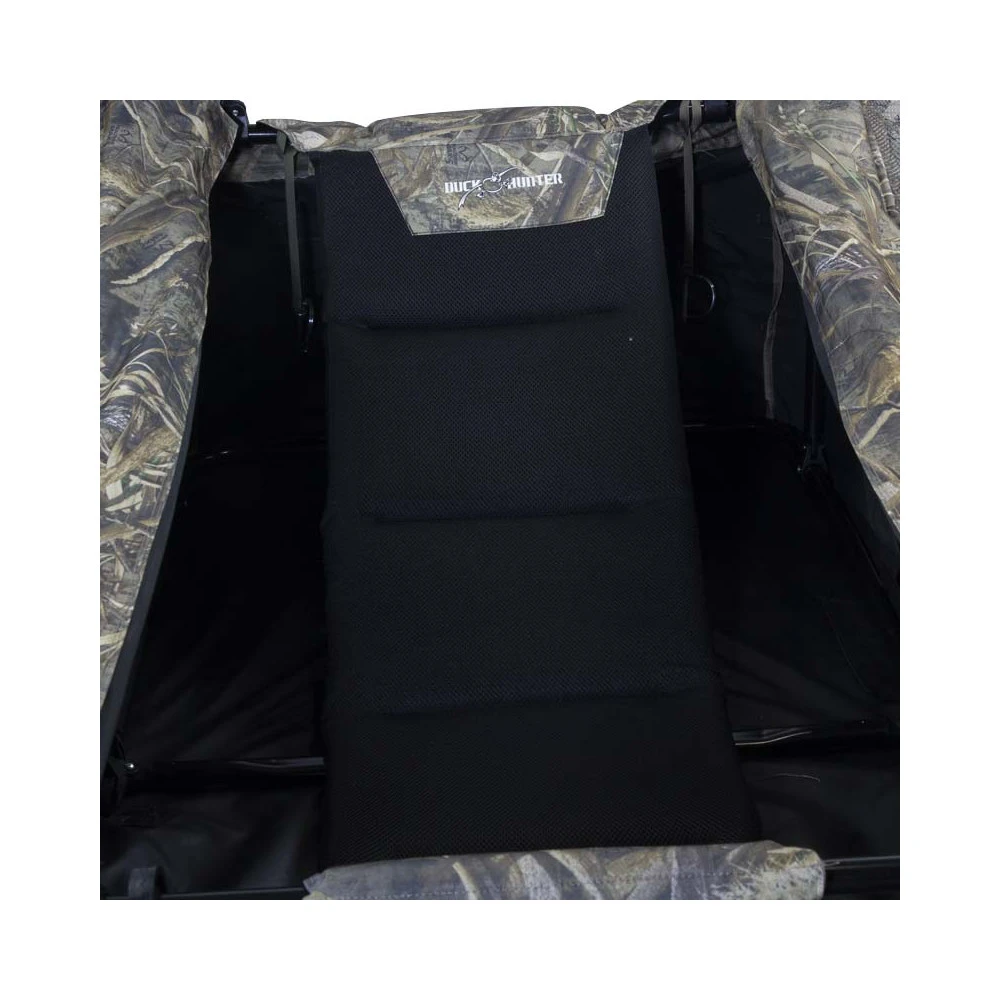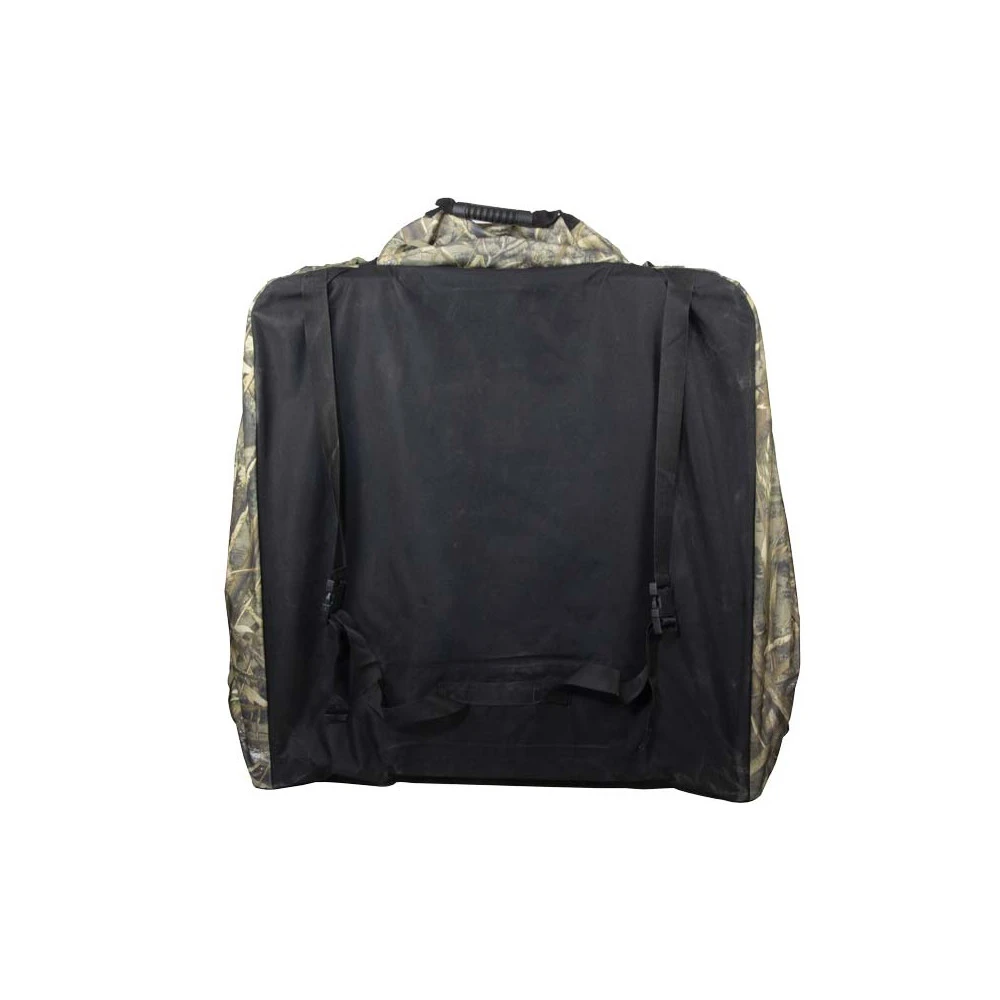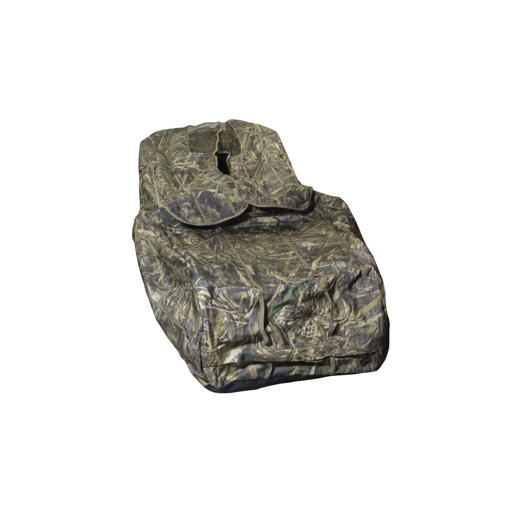 Le chasseur est installé sur un matelas rembourré et dont la tension est réglable, cela lui permet d’ajuster sa position dans la cache. L’affût dispose d’une armature en aluminium, à la fois légère et résistante, un repose canon rembourré permet de positionner l’arme en sécurité sans risque d’abîmer le canon. Grâce aux multiples passants disposés sur l’ensemble de la cache, des végétaux pourront y être ajouté afin d’augmenter le camouflage. La cache est conçue en toile épaisse de 600 deniers imprimée du motif de camouflage Realtree Max5. Elle affiche des dimensions de 210 x 92 x 45 cm. Pour le transport, la cache se replie sur elle-même, elle est équipée de deux sangles permettant de la transporter en sac à dos.