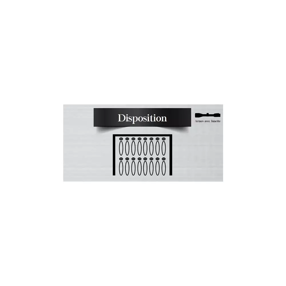 Vos armes reposent sur une mousse haute-densité et anti-corrosion, la crosse se pose sur un tapis au sol. Les armoires fortes Elite Alpha sont équipées de trous pour une fixation murale ou au sol, indispensable pour offrir une sécurité optimale. Il dispose d’un second petit coffre sur la partie supérieure pour vos petits objets précieux, accessoires ou munitions. La disposition des armes à l’intérieur du coffre fort est répartie en deux rangées de 8 armes. L’espace est suffisant pour accueillir des fusils ou carabines surmontés de leurs optiques.