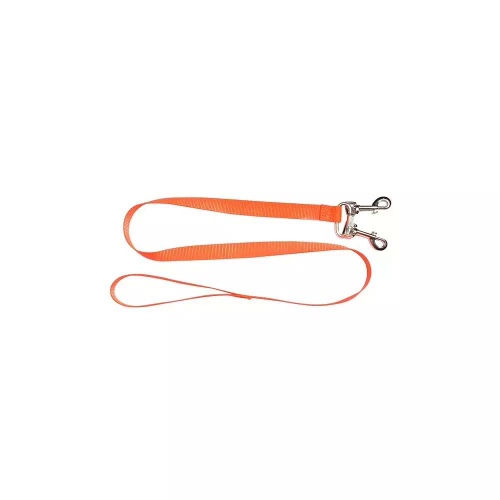 Laisse pour deux chiens en nylon avec double mousquetons. Longueur 1,30 m. Orange fluo. Marque Country.