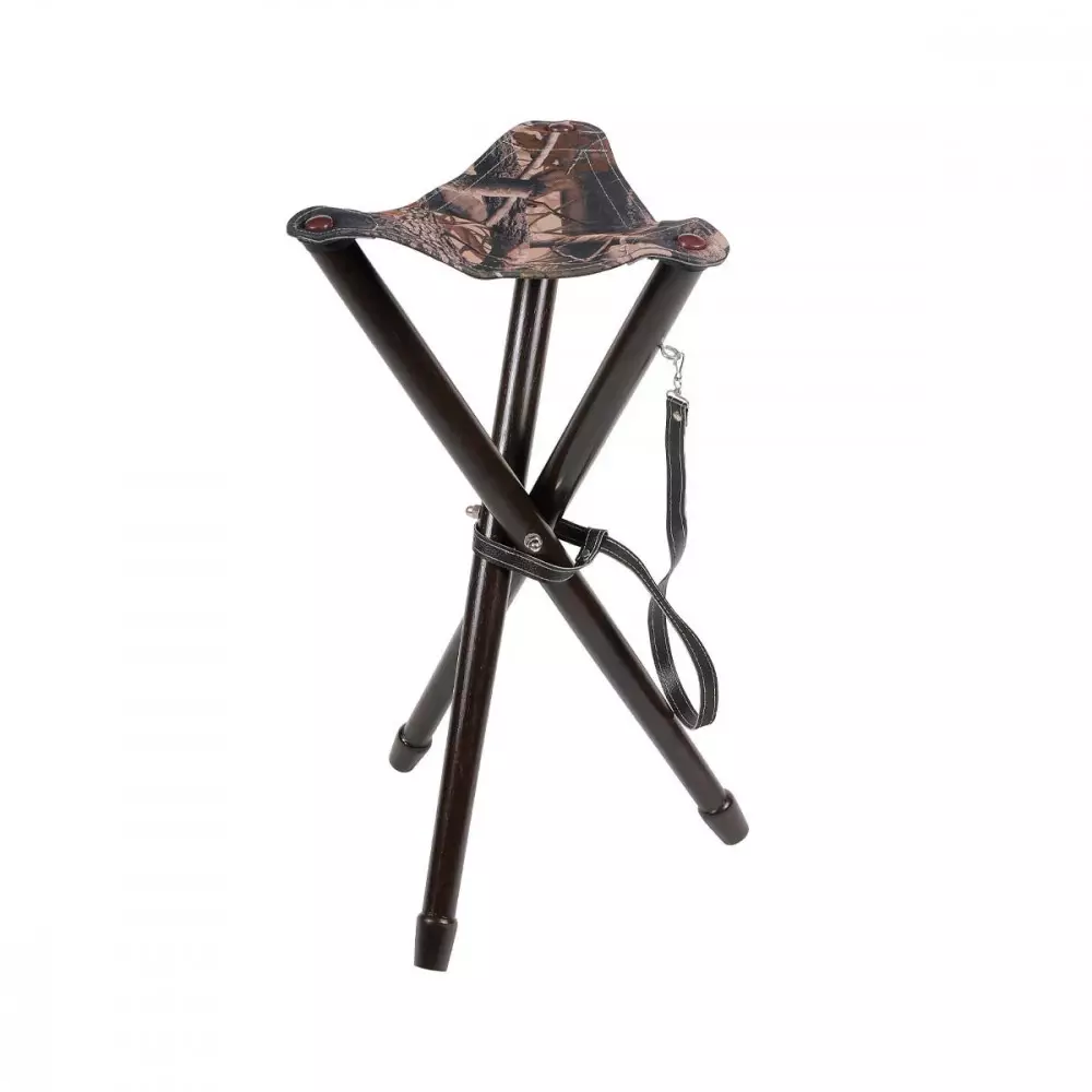 Siège trépied en bois idéal pour vos affûts et battues. Assise en toile imprimée d’un motif de camouflage. Hauteur : 65 cm.